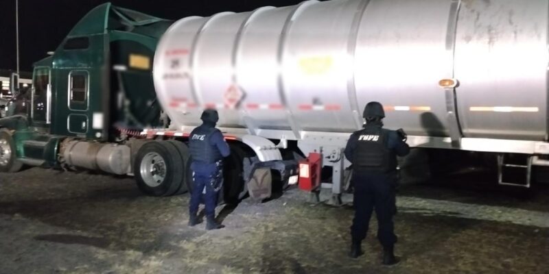 Celaya, Guanajuato., a 19 de febrero de 2026.- La Secretaría de Seguridad y Paz, a través de los Integrantes de las Fuerzas de Seguridad Pública del Estado (FSPE) aseguraron un tractocamión con aproximadamente 46 mil litros de diésel presuntamente ilícito en la colonia Praderas de Santa Lucía.