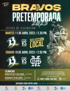 Los Bravos de León tendrán dos partidos en el diamante ‘Ciro Soto Lara’, ante una Selección Local, conformada por jugadores de Celaya y sus comunidades. El segundo encuentro será ante Mariachis de Guadalajara. Los boletos se venderán en las oficinas del SIDEC.